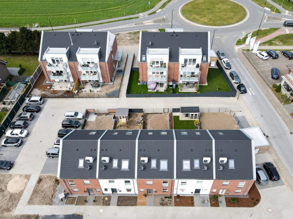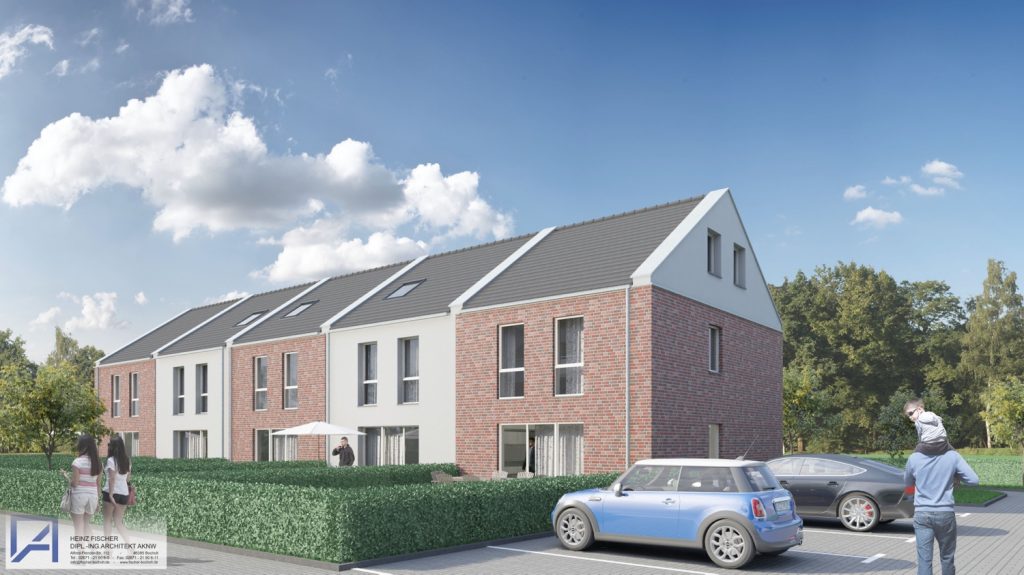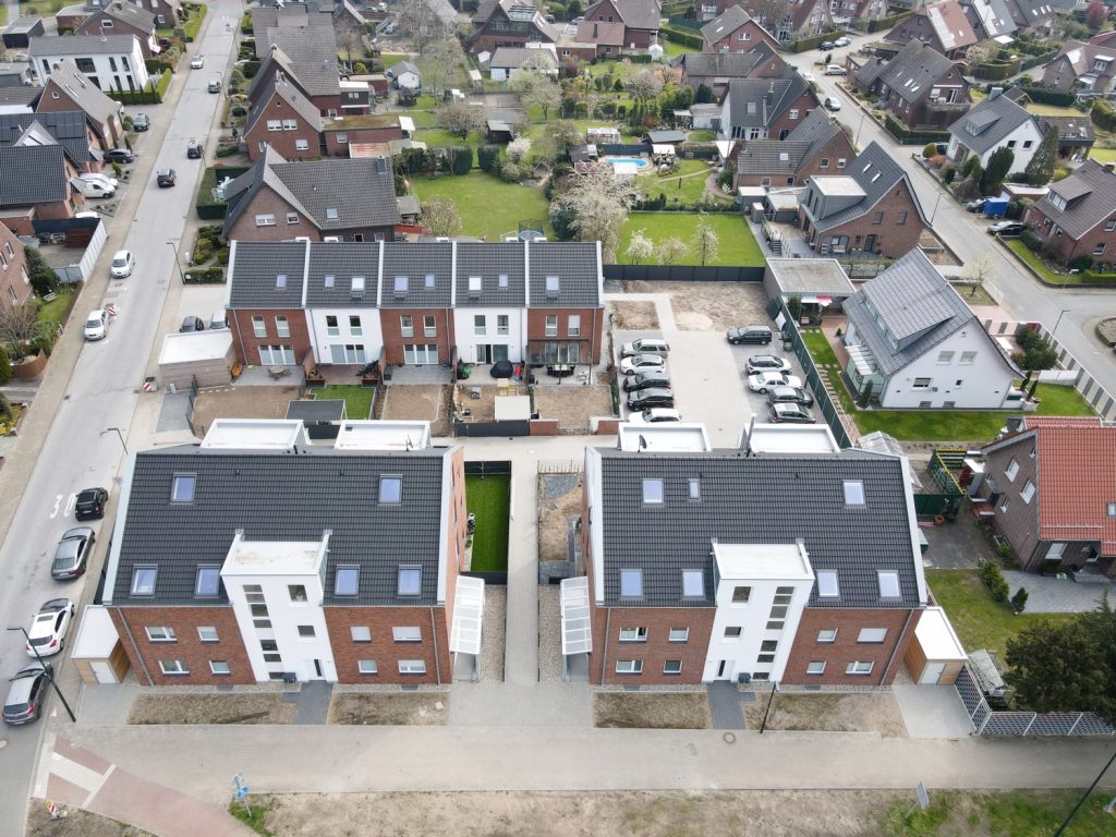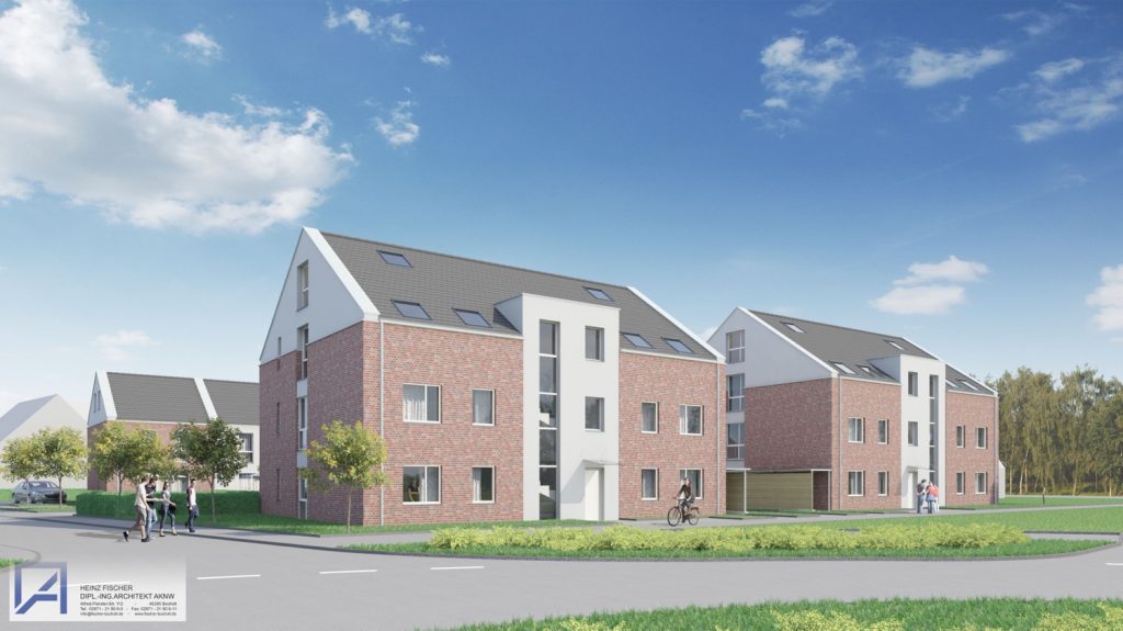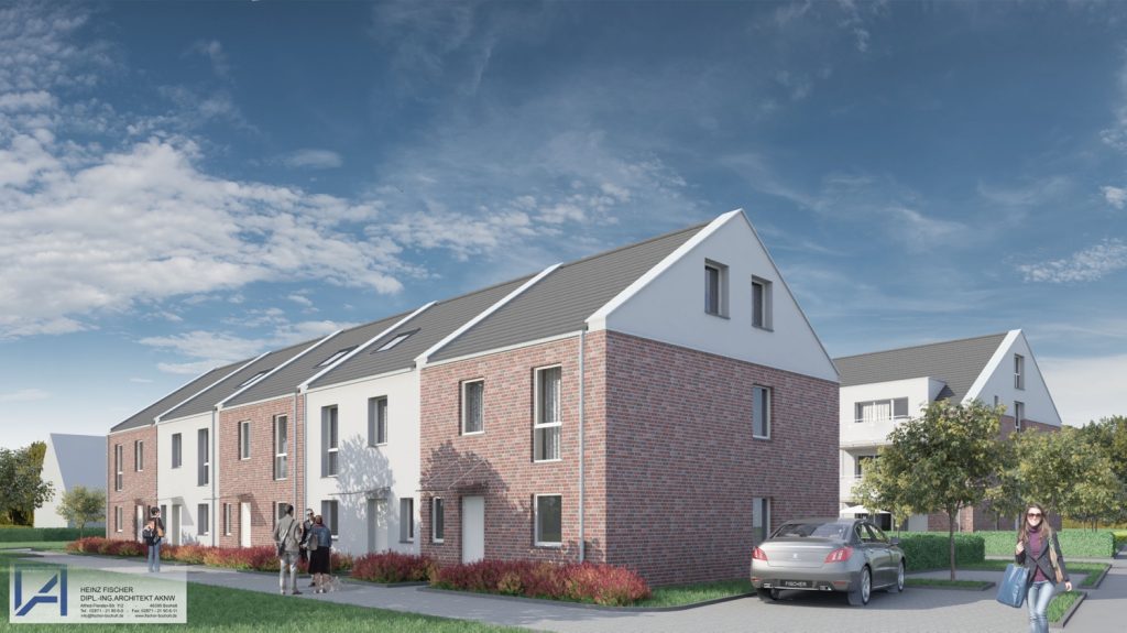 5 zweigeschossige Reihenhäuser mit je 160 qm Wohnfläche und 2 Mehrparteienhäuser mit je 6 Wohneinheiten, mit Luftwärmepumpenheizung entstanden. Die Stellplatzanlage konnte ebenfalls großzügig geplant werden. Hier ist noch zu erwähnen, dass es, dank des Bauamts Hamminkeln, ein außergewöhnlich schnelles Genehmigungsverfahren gegeben hat.